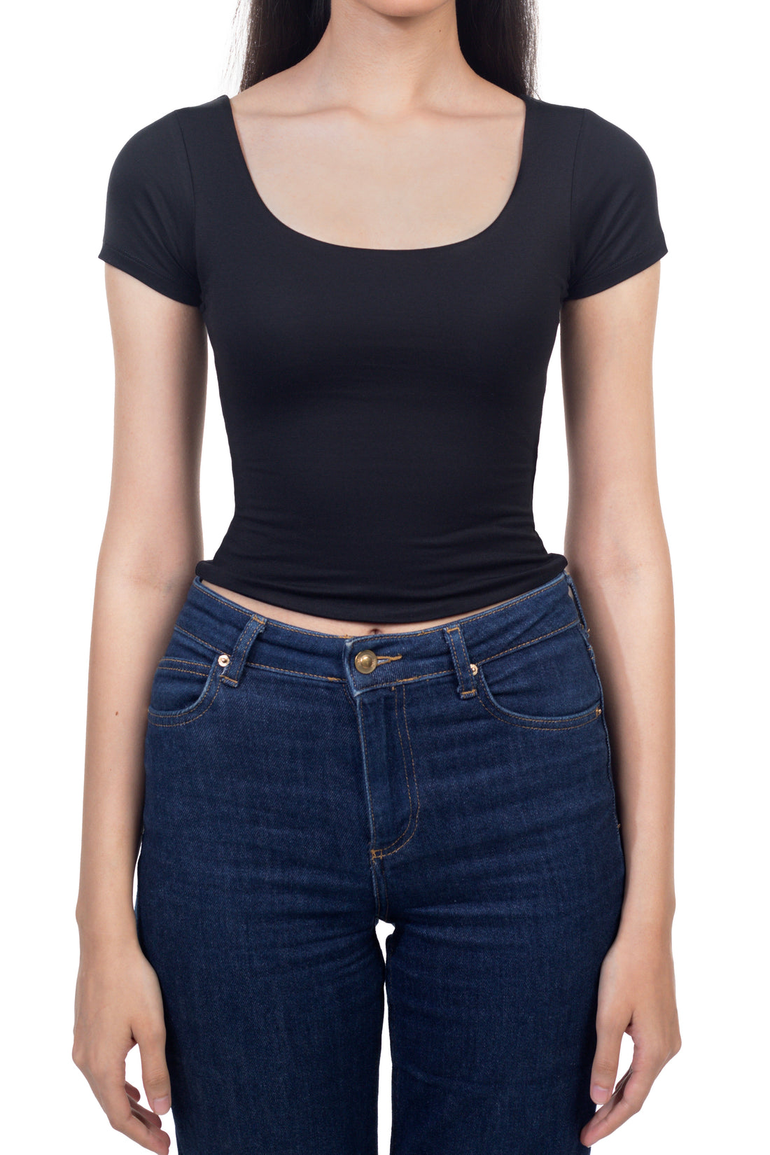 squares things out, literally. a soft square neckline, mid length and our typical snug fit....